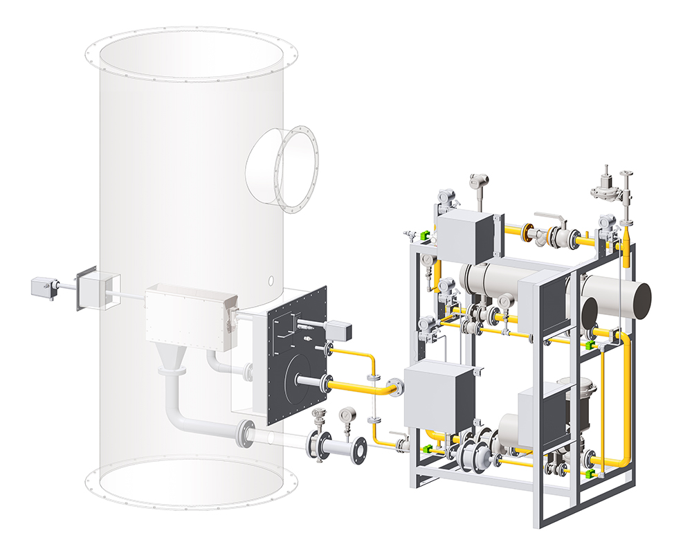 Мы поставили полную систему подогрева от исходящего газа для SCR, горелку HLPB, установленную внутри газохода, подогрев отходящих газов от 190°C до 230°C, систему горелки, оснащенную 2-мя канальными конфорками, нагнетателем горения, рампой газа и шкафами управления, горелки оснащены 2 УФ-сканерами и 1 ионизационным стержнем для обеспечения 100% обнаружения пламени, 4 шкафа для трансформатора зажигания, управления альтернативным сигналом, управления цифровым сигналом и источника питания 24 В постоянного тока.